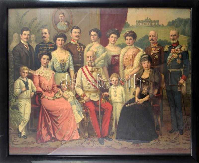 cca 1914-1916 Habsburg császári és király család, rajta I. Ferenc József, Károly főherceg, trónörökös (IV. Károly), Zita főhercegné, Otto főherceg, Mária Valéria főhercegnő, Ferenc Salvator főherceg, Lipót bajor királyi herceg és mások, papír, litográfia, üvegezett fa keretben, 39x50, keret: 43x55 cm