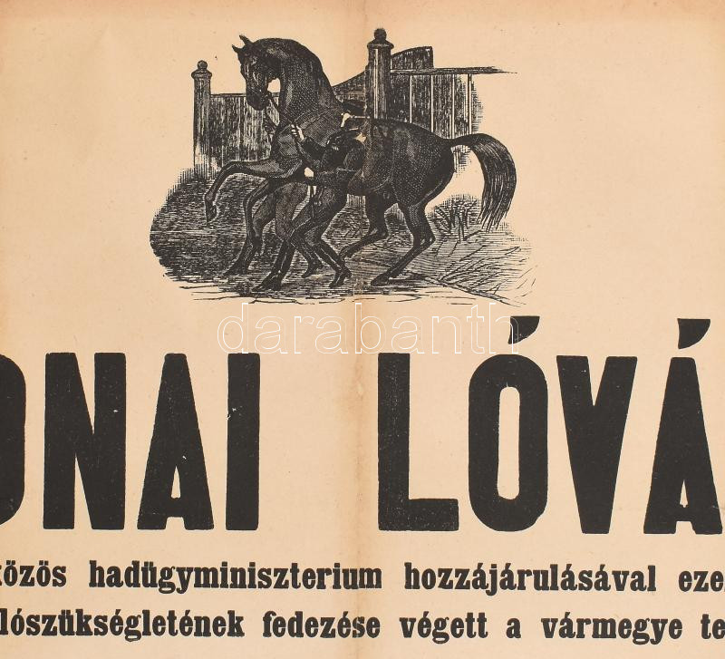 1896 Bp., Katonai lóvásár hirdetménye, restaurált, 62×47 cm https://www.darabanth.com/hu/515-Filatelia-kepeslap-numizmatika-mutargy-konyv-papirregiseg-ekszer-aukcio/518.0/Mutargy-papirregiseg-egyeb/Militaria~1067/1896-Bp-Katonai-lovasar-hirdetmenye-restauralt-62C39747-cm~II3485706