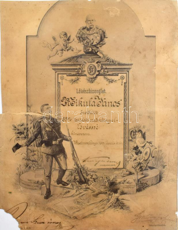 1907 Lövészbizonylat, oklevél Ferenc József arcképével, szakadással 24... https://www.darabanth.com/hu/515-Filatelia-kepeslap-numizmatika-mutargy-konyv-papirregiseg-ekszer-aukcio/518.0/Mutargy-papirregiseg-egyeb/Militaria~1067/1907-Loveszbizonylat-oklevel-Ferenc-Jozsef-arckepevel-szakadassal-24x32-cm~II3425062