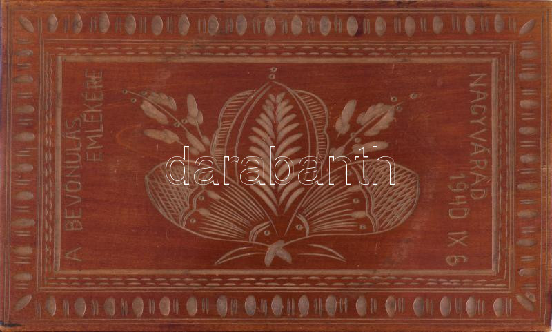 Leírás: Nagyvárad 1940 IX. 6. A bevonulás emlékére - A nagyváradi bevonulás emlékére vésett fadoboz, 13x22 cm