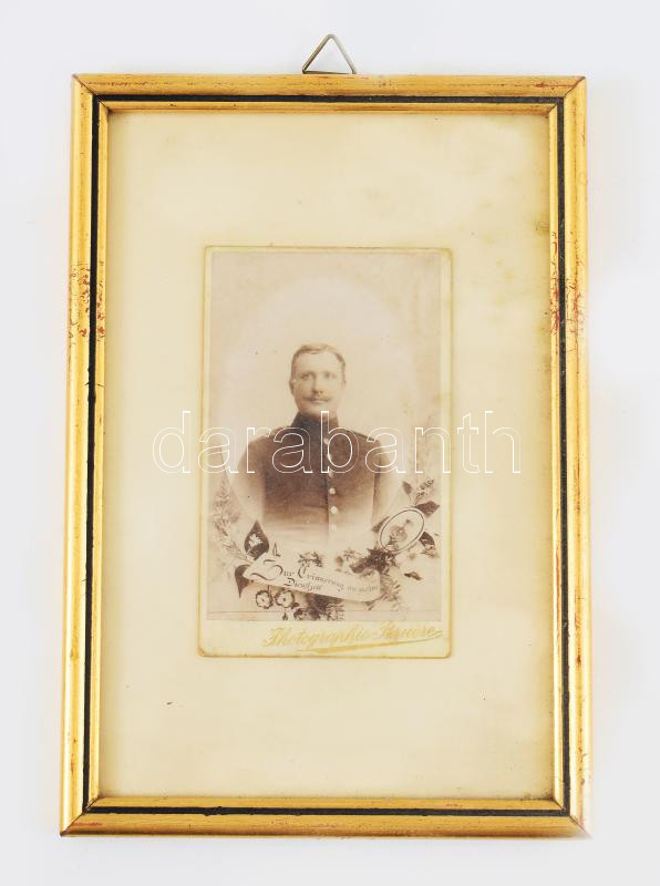 Leírás: cca 1880 Katona vizitkártya fotója, szolgalati idei emlékezésre vonatkozó felirattal 7x11 cm Üvegezett keretben