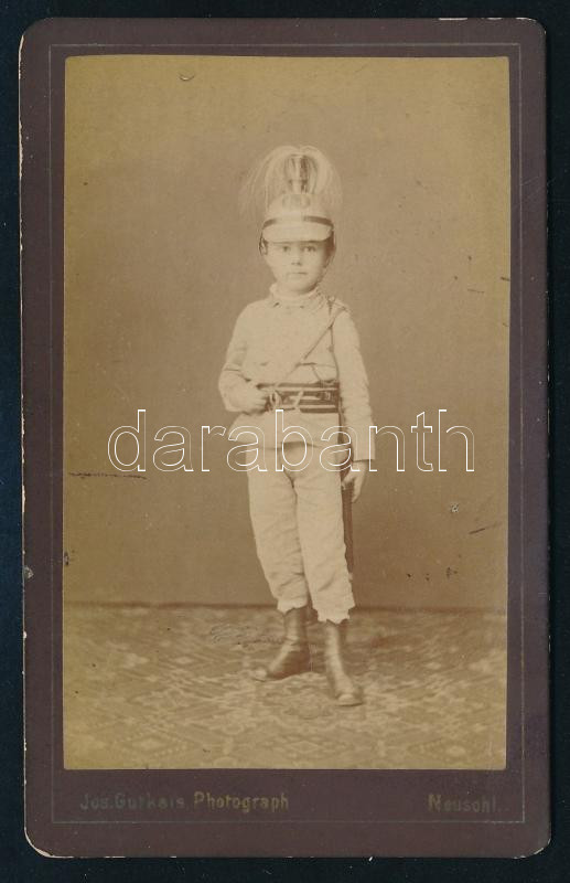 Leírás: cca 1880 Kisfiú egyenruhában, keményhátú fotó Gutkaiss (Besztercebánya, Baden) műterméből, 10,5×6,5 cm