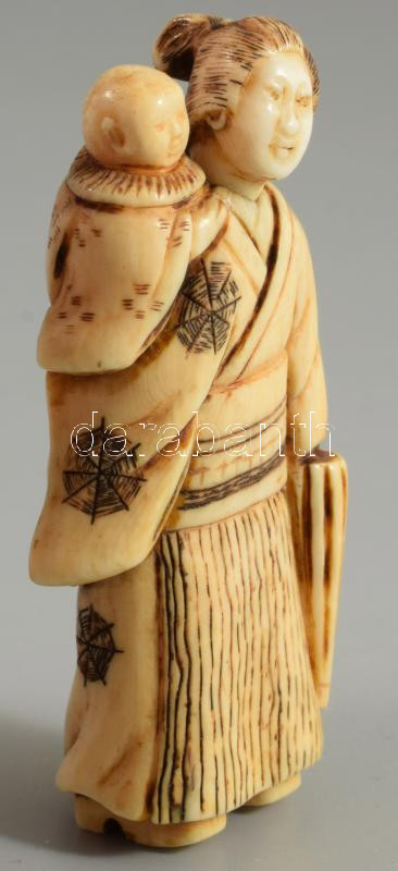 Leírás: Antik japán csont okimono - Nő gyermekével. Jelzett, m: 7 cm