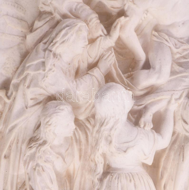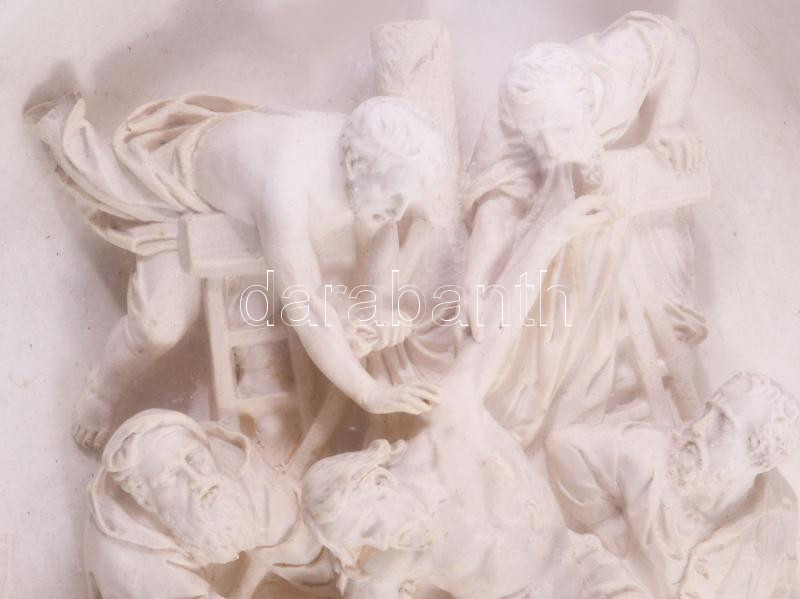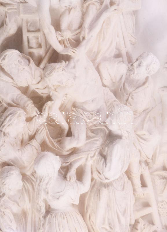 Leírás: Levétel a keresztről. Faragott tajtékkő jelenet, domború üveggel üvegezett ovális fa keretben. Franciaország, 19. sz. vége, hibátlan, 40x32 cm