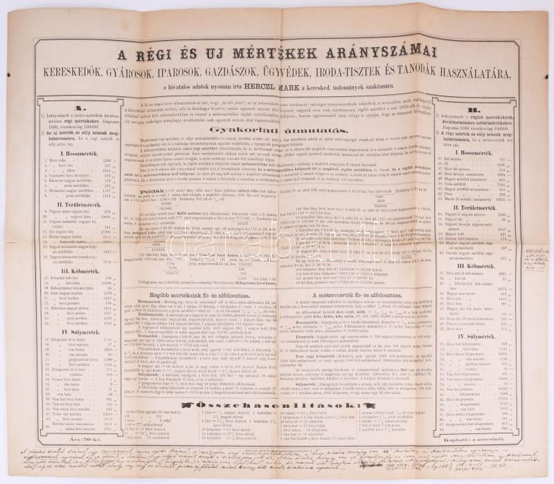 1875 A régi és új mértékek arányszámai. Kereskedők, gyárosok, iparosok, gazdászok, ügyvédek, iroda-tisztek és tanodák használatára, a hivatalos adatok nyomán írta Herczl Márk. Debrecen, 1875, ifj. Csáthy Károly, a lap szélén kézzel írt feljegyzésekkel, kihajtva: 48,5x61,5 cm