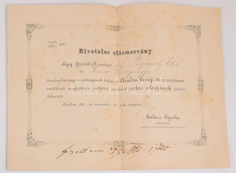 Leírás: 1881 Hivatalos elismervény az aradi vértanúk szobrára adott adományról. + kapcsolódó későbbi újságcikk