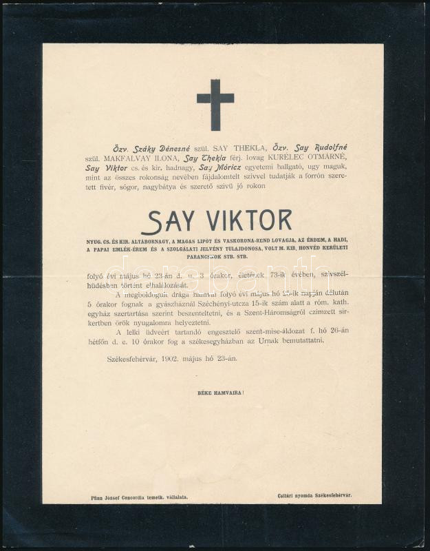Leírás: 1902 Székesfehérvár, Say Viktor (1829-1902) nyug. cs. és kir. altábornagy, a Lipót- és Vaskorona-rend lovagja halotti értesítője, 26,5x20,5 cm