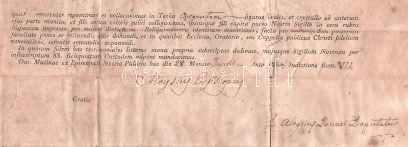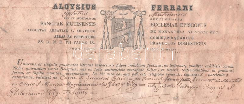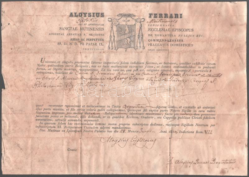 Leírás: 1849 Luigi Ferrari (1792-1851) modenai püspök (1848-1851) által aláírt egyházi dokumentum, foltos, a hátoldalán javított, hajtott, 23x32 cm /