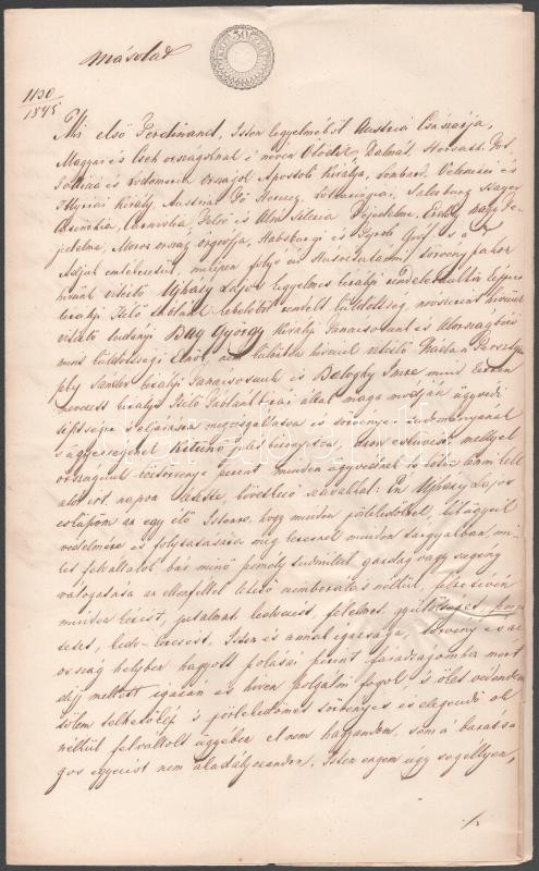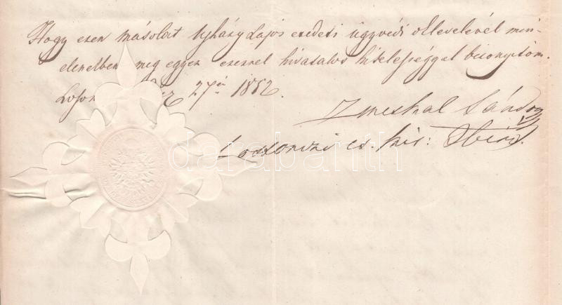 Leírás: 1852 Losonc, Ujházy Lajos ügyvédi oklevelének hiteles másolata, két beírt oldal, Zmeskal Sándor losonci cs. kir. járásbíró aláírásával, papírfelzetes pecséttel, 30kr szigenettával