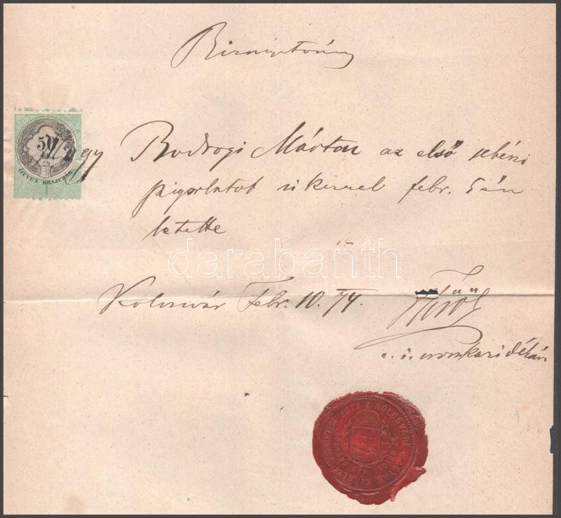 Leírás: 1874 Kolozsvár, a Magyar Királyi Kolozsvári Tudományegyetem (alapítva: 1872) orvostudományi karának dékánja által kiállított bizonyítvány sebészi szigorlatról, 50kr okmánybélyeggel, viaszpecséttel