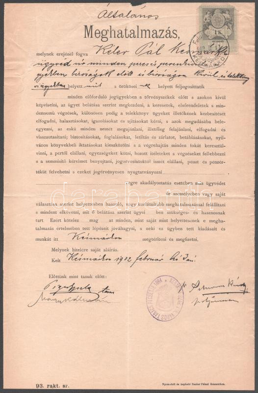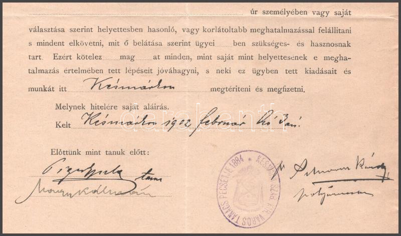 Leírás: 1902 Késmárk, ügyvédi meghatalmazás 1K okmánybélyeggel, "Késmárk szab. kir. város tanács pecsétje" bélyegzéssel