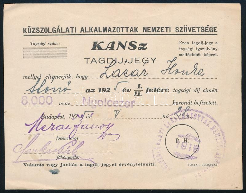 1925 Bp., Közszolgálati Alkalmazottak Nemzeti Szövetsége (KANSz) tagdí... https://www.darabanth.com/hu/515-Filatelia-kepeslap-numizmatika-mutargy-konyv-papirregiseg-ekszer-aukcio/518.0/Mutargy-papirregiseg-egyeb/Okmanyok~1057/1925-Bp-Kozszolgalati-Alkalmazottak-Nemzeti-Szovetsege-KANSz-tagdij-jegy-8000K-tagsagi-di~II3447525