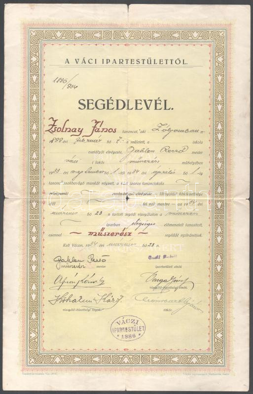 1934 Segédlevél a váci ipartestülettől, műszerész részére https://www.darabanth.com/hu/515-Filatelia-kepeslap-numizmatika-mutargy-konyv-papirregiseg-ekszer-aukcio/518.0/Mutargy-papirregiseg-egyeb/Okmanyok~1057/1934-Segedlevel-a-vaci-ipartestulettol-muszeresz-reszere~II3411316