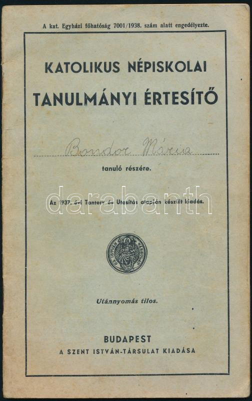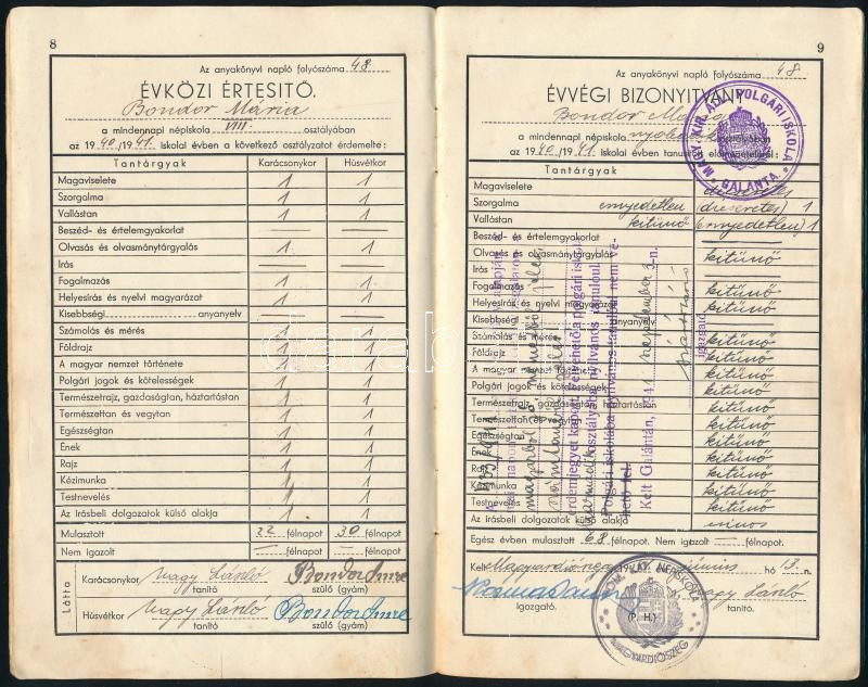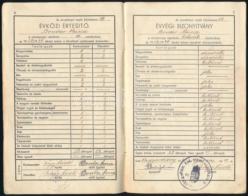 1939-1941 A felvidéki Magyardiószeg (ma Diószeg városrésze) katolikus népiskolai tanulmányi értesítője, három évi tantárgyi eredménnyel kitöltve Bondor Mária rézére, jó állapotban
