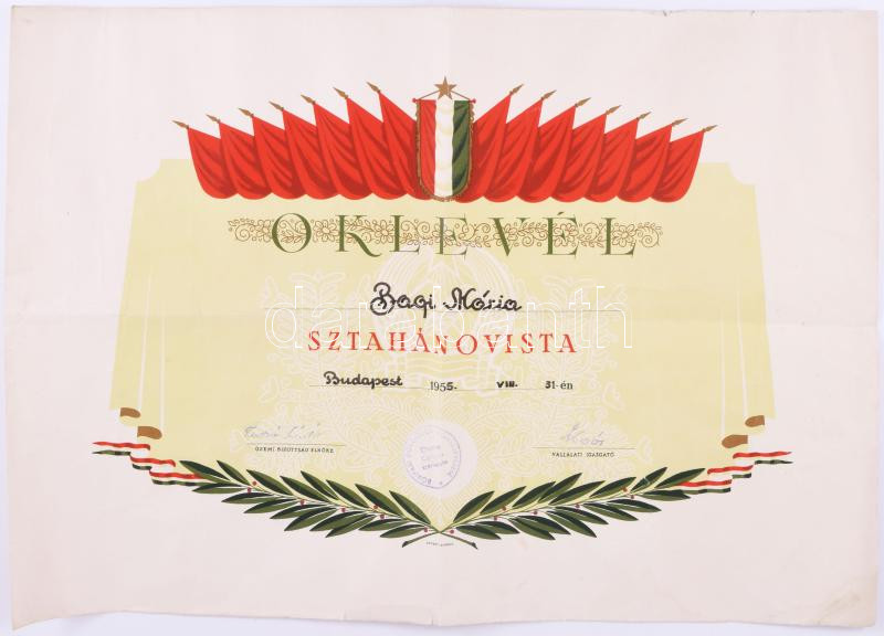 1955 "Sztahánovista" oklevél, hajtva, kis sérülésekkel, 33,5... https://www.darabanth.com/hu/515-Filatelia-kepeslap-numizmatika-mutargy-konyv-papirregiseg-ekszer-aukcio/518.0/Mutargy-papirregiseg-egyeb/Okmanyok~1057/1955-Sztahanovista-oklevel-hajtva-kis-serulesekkel-33-5x47-5-cm~II3488223