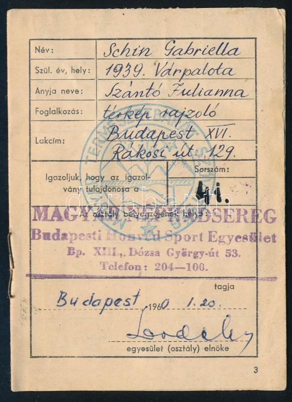 Leírás: 1960 Magyar Természetbarát Szövetség - Magyar Néphadsereg Budapesti Honvéd Sport Egyesület (BHSE) igazolvány Schin Gabriella térképrajzoló részére, bélyegekkel