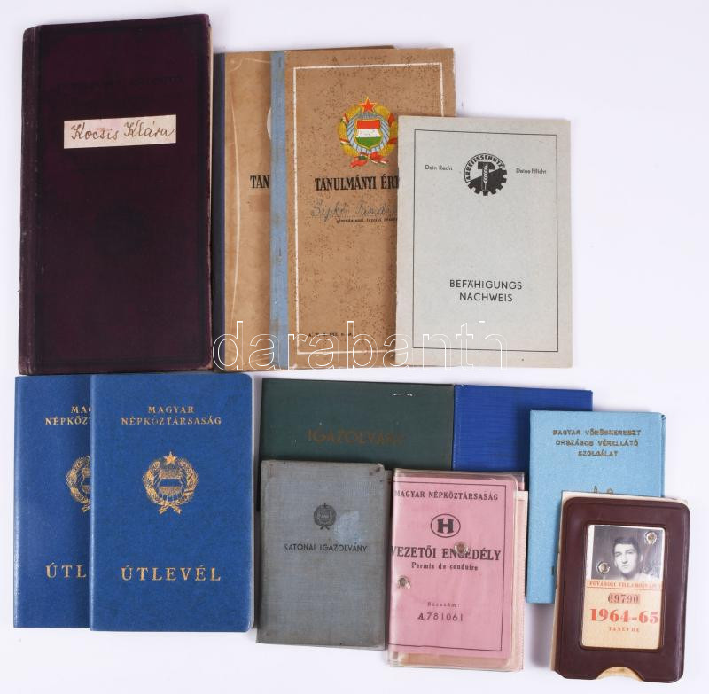 Leírás: Vegyes igazolvány tétel: vezetői engedély, véradó igazolvány, kék útlevelek, stb., összesen 14 db