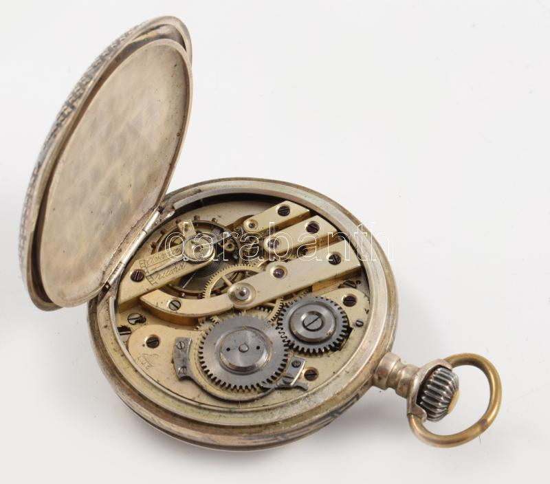 Leírás: Antik ezüst (Ag) tokos zsebóra, jelzett, működik, címeres díszítéssel, sérült üveggel és számlappal, működik, d: 5 cm, bruttó 98g