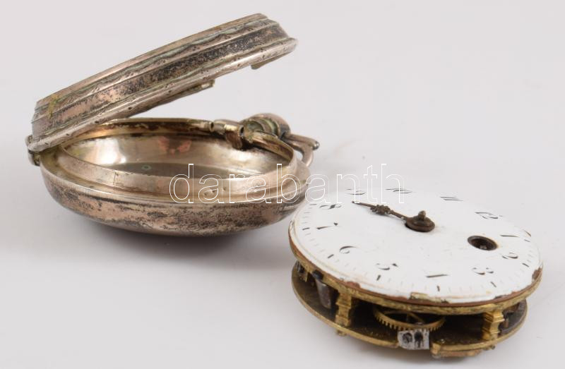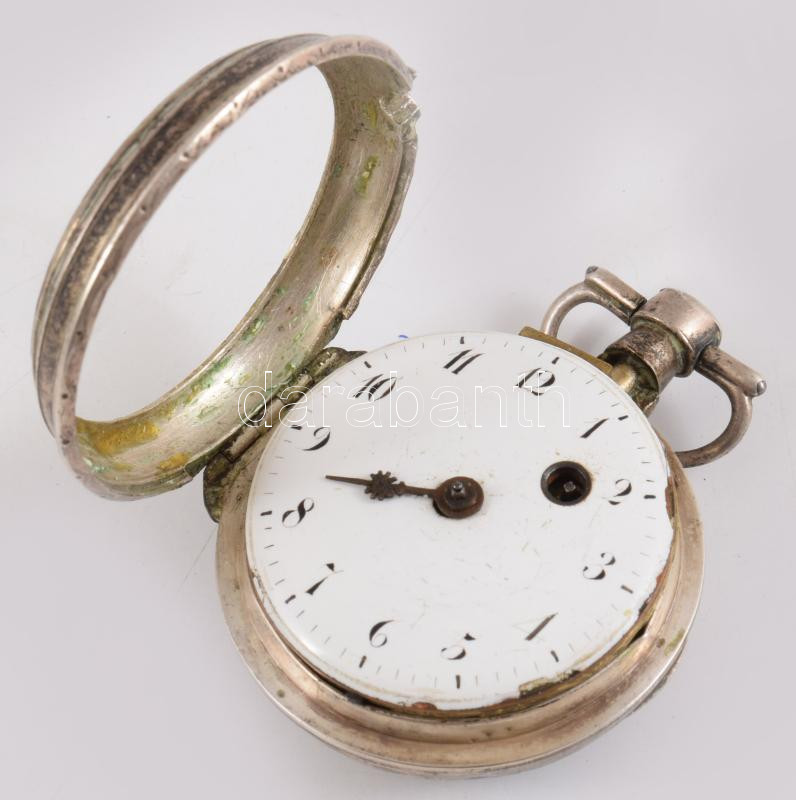 Leírás: Ezüst (Ag) tokos antik zsebóra, hiányos, sérült, nem működik, d: 45mm, bruttó 70,5g