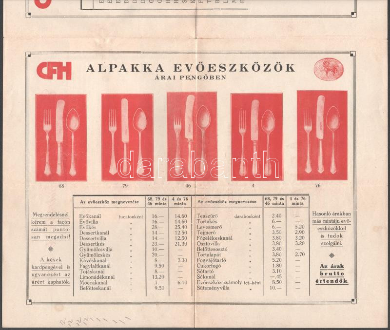 Leírás: 1927 Hutschenreuter német cég magyarországi vezérképviselője Dombos Béla kétlapos illusztrált árjegyzéke alpakka eszközökről, hajtva, jó állapotban