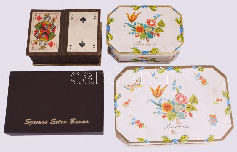 Leírás: 4 darab régi karton doboz, közte kártyatartó díszítésű bonbonos doboz.