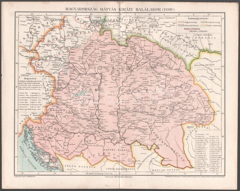 Leírás: Magyarország Mátyás király halálakor (1490), tervezte: Dr. Márki Sándor, Pallas Nagy Lexikona, kiadja: Posner Károly Lajos és Fia, 24×30 cm