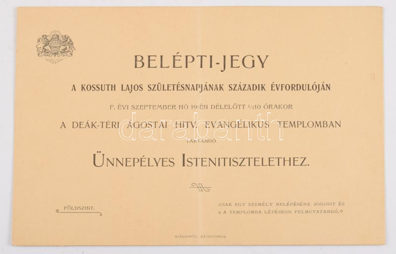1902 Kossuth Lajos születésnapjának 100. évfordulójára tartott istentisztelet belépőjegye a Deák téri templomba.