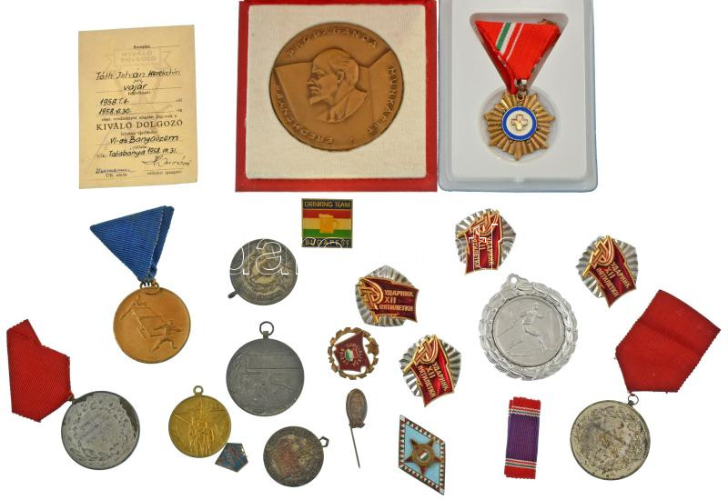 Vegyes 19db-os vegyes magyar és szovjet szocialista kitüntetés, jelvény, sportérem tétel, közte ~1970. "Zrínyi Katonai Akadémia" zománcozott fém sapkajelvény (46x33mm), közte tokosak is T:AU-VF