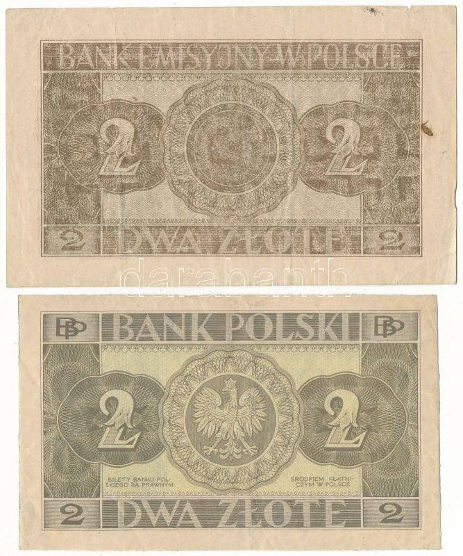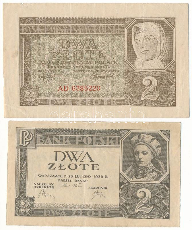 Poland 1936. 2 Złotych + 1941... https://www.darabanth.com/hu/515-Filatelia-kepeslap-numizmatika-mutargy-konyv-papirregiseg-ekszer-aukcio/518.0/Numizmatika/Kulfoldi-bankjegyek~672/Lengyelorszag-1936-2Zl-plus-1941-2Zl-TF3Cbr-3E-Poland-1936-2-ZC582otych-plus-1941-2-ZC582otych-CF~II3452919