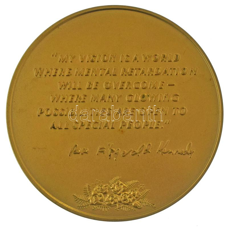 Amerikai Egyesült Államok DN "Rose Fitzgerald Kennedy - Leadership award / My vision is a world where mental retardation will be overcome-where many glowing possibilities are open to all special people." kétoldalas, aranyozott bronz plakett (76mm) T:AU kis patina