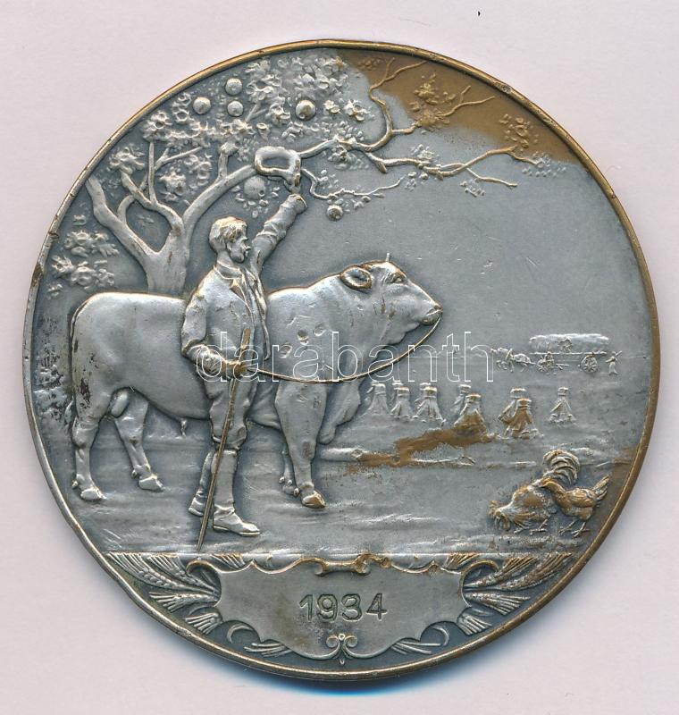 Ausztria 1934. "Dem Fortschritte - Die Niederösterreiches Landes-Landwirtschaftskammer (A haladásért - Alsó-Ausztriai Állami Mezőgazdasági Kamara)" kétoldalas, ezüstözött bronz érdemérem, hátoldalán "1934" gravírozással (55mm) T:XF kopott ezüstözés