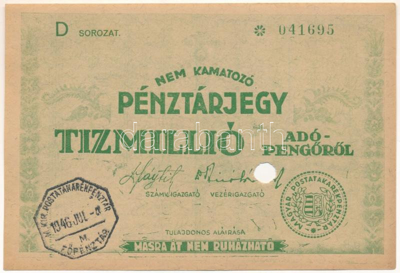 Leírás: 1946. 10.000.000AP nem kamatozó Pénztárjegy "D 041695" "Másra át nem ruházható" felülbélyegzéssel, lyukasztással érvénytelenítve T:AU