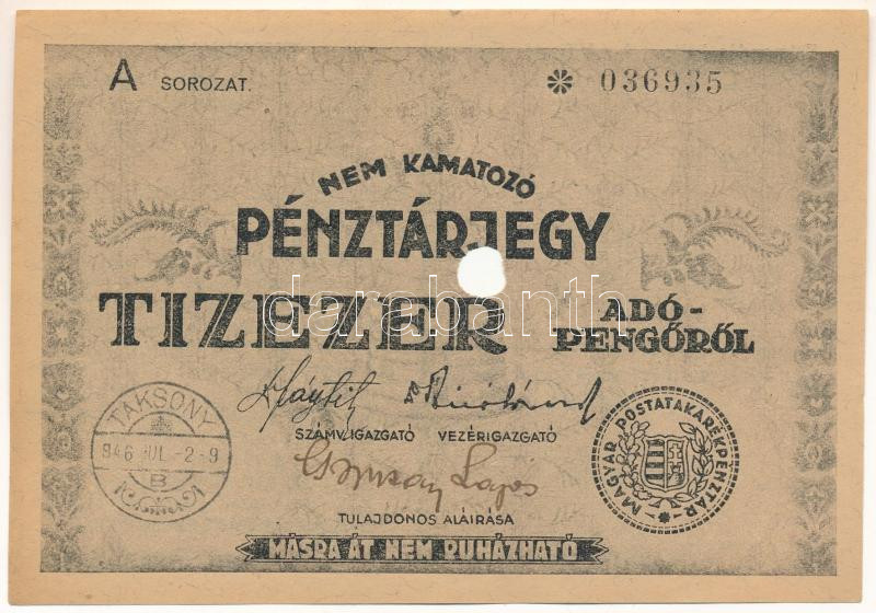 Leírás: 1946. 10.000AP nem kamatozó Pénztárjegy "A * 036935" "Másra át nem ruházható" "Taksony" felülbélyegzéssel, hátoldalon bélyegzés T:AU