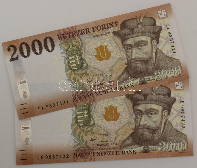 2016. 2000Ft (2x) sorszámkövetők "CE 9857421 - CE 9857422" T... https://www.darabanth.com/hu/515-Filatelia-kepeslap-numizmatika-mutargy-konyv-papirregiseg-ekszer-aukcio/518.0/Numizmatika/Magyar-bankjegyek~665/2016-2000Ft-2x-sorszamkovetok-CE-9857421-CE-9857422-TUNC-AU~II3485165
