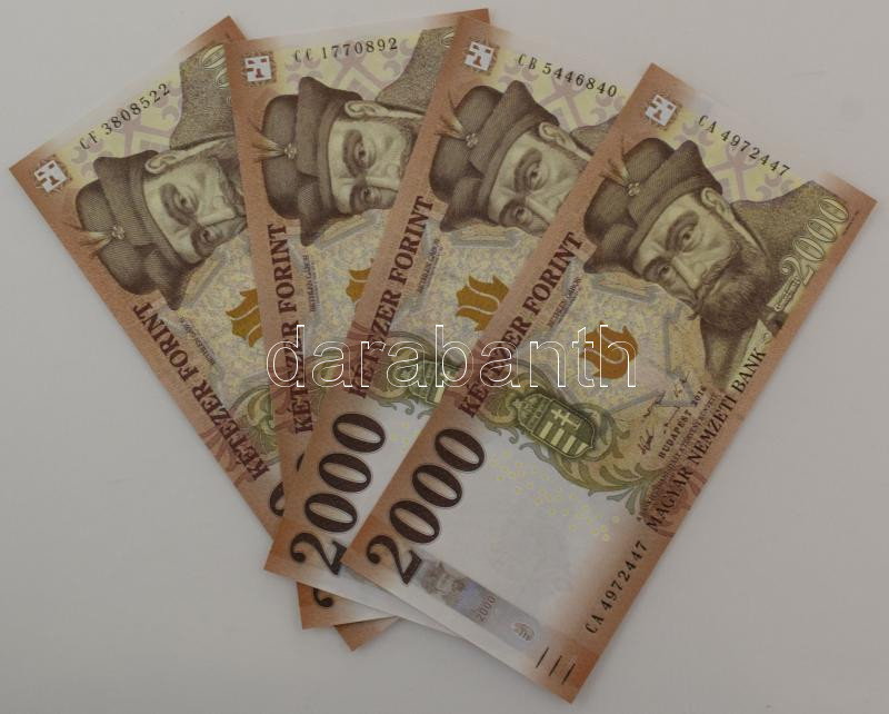 2016. 2000Ft (4x) mind különféle sorozatjellel: "CA", "... https://www.darabanth.com/hu/515-Filatelia-kepeslap-numizmatika-mutargy-konyv-papirregiseg-ekszer-aukcio/518.0/Numizmatika/Magyar-bankjegyek~665/2016-2000Ft-4x-mind-kulonfele-sorozatjellel-CA-CB-CC-CF-T-UNC-AU~II3485168