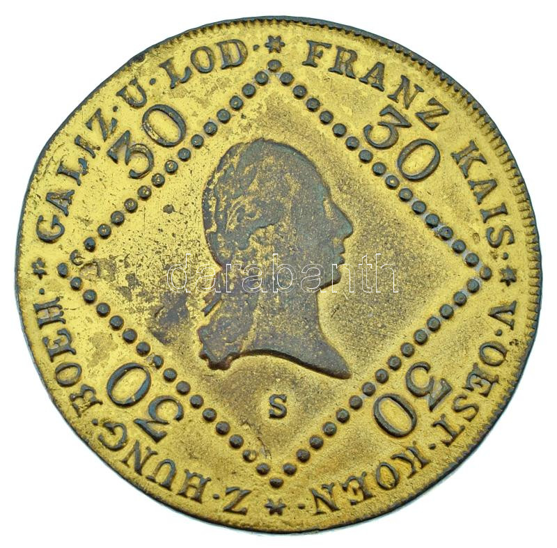 1807S 30kr Cu "I. Ferenc" aranyozva, jelvénnyé alakítva T:VF... https://www.darabanth.com/hu/515-Filatelia-kepeslap-numizmatika-mutargy-konyv-papirregiseg-ekszer-aukcio/518.0/Numizmatika/Magyar-es-magyar-verdejelu-fem-es-ezustpenzek~666/1807S-30kr-Cu-I-Ferenc-aranyozva-jelvennye-alakitva-T-VFKrause-KM232149~II3484885