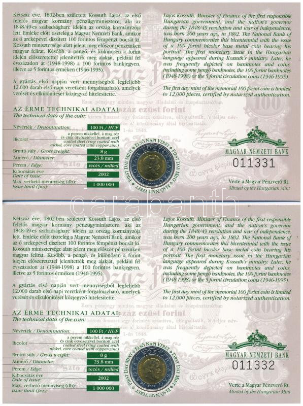 Leírás: 2002. 100Ft "Kossuth" (2x) elsőnapi veretek, sorszámkövető díszlapokon "011331", "011332" T:UNC Adamo FOEM1