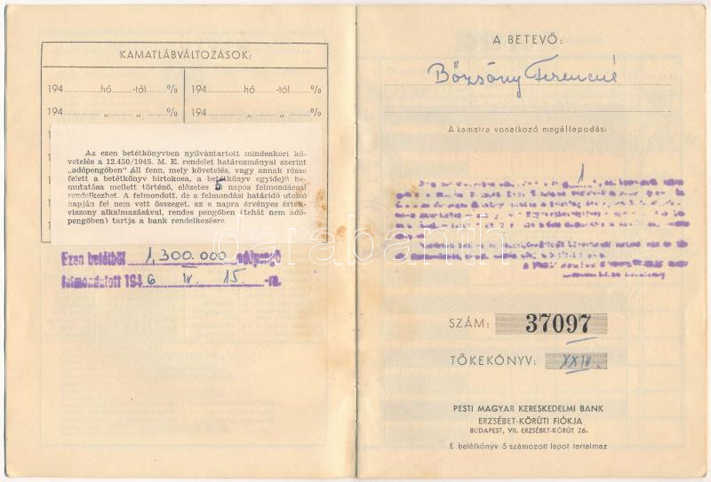 1946. "Pesti Magyar Kereskedelmi Bank" takarék betétkönyve, ... https://www.darabanth.com/hu/515-Filatelia-kepeslap-numizmatika-mutargy-konyv-papirregiseg-ekszer-aukcio/518.0/Numizmatika/Numizmatikaval-kapcsolatos-egyeb-tetelek~661/1946-Pesti-Magyar-Kereskedelmi-Bank-takarek-betetkonyve-reszben-kitoltve~II3484000