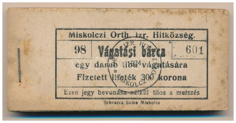 1924. Miskolc 300K "Miskolczi Orth. Izraelita Anyahitközség"... https://www.darabanth.com/hu/515-Filatelia-kepeslap-numizmatika-mutargy-konyv-papirregiseg-ekszer-aukcio/518.0/Numizmatika/Papir-es-fem-szuksegpenzek~664/1924-Miskolc-300K-3Cem3EMiskolczi-Orth-Izraelita-Anyahitkozseg3Cem3E-vagatasi-jegy-ertekjeg~II3446457