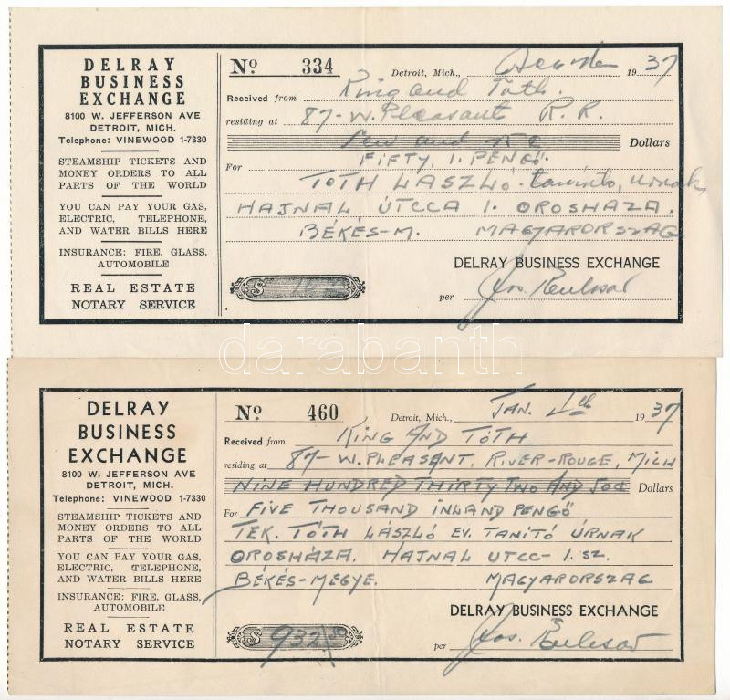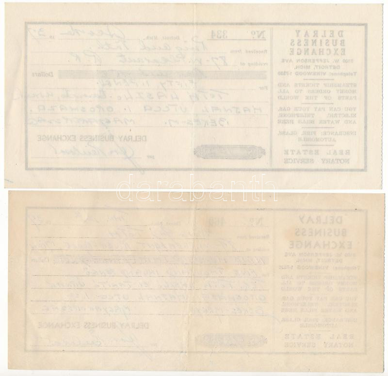 Amerikai Egyesült Államok 1937. Detroit 2db váltó, egyik 932,50$, mási... https://www.darabanth.com/hu/515-Filatelia-kepeslap-numizmatika-mutargy-konyv-papirregiseg-ekszer-aukcio/518.0/Numizmatika/Papir-es-fem-szuksegpenzek~664/Amerikai-Egyesult-Allamok-1937-Detroit-2db-valto-egyik-932-50USD-masik-10-15USD-ertekben-T-F-kis~II3493286