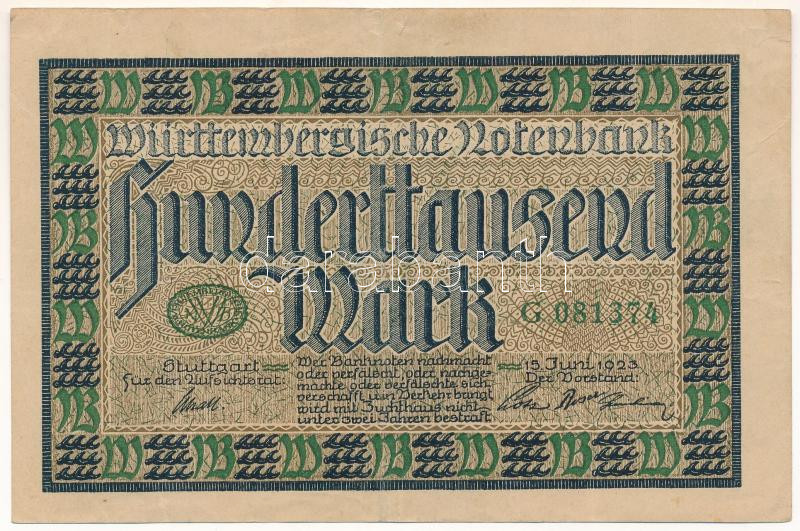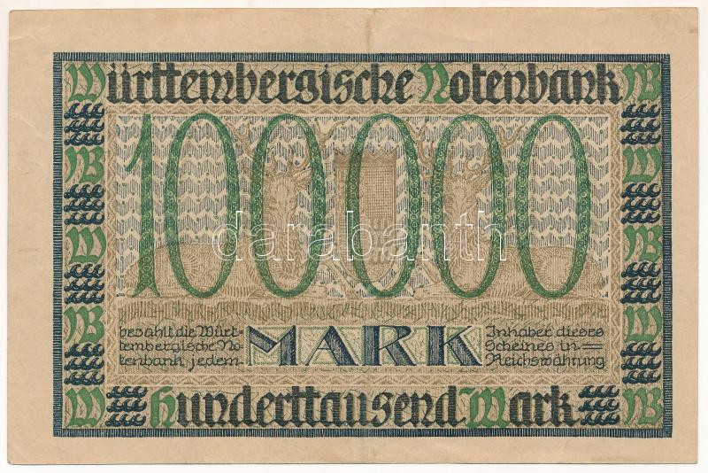 Német Birodalom / Weimari Köztársaság / Württemberg / Stuttgart 1923. ... https://www.darabanth.com/hu/515-Filatelia-kepeslap-numizmatika-mutargy-konyv-papirregiseg-ekszer-aukcio/518.0/Numizmatika/Papir-es-fem-szuksegpenzek~664/Nemet-Birodalom-Weimari-Koztarsasag-Wurttemberg-Stuttgart-1923-100000M-T-FGerman-Empire-~II3472605