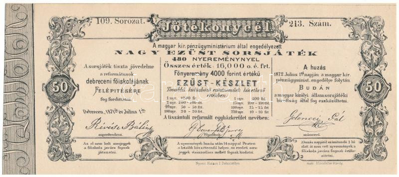 Leírás: 1871. Debrecen "Jótékony cél - Nagy Ezüst Sorsjáték " sorsjegye 50kr értékben a Debreceni Református Főiskola felépítésére, "109. 213." sorozat és sorszámmal T:AU