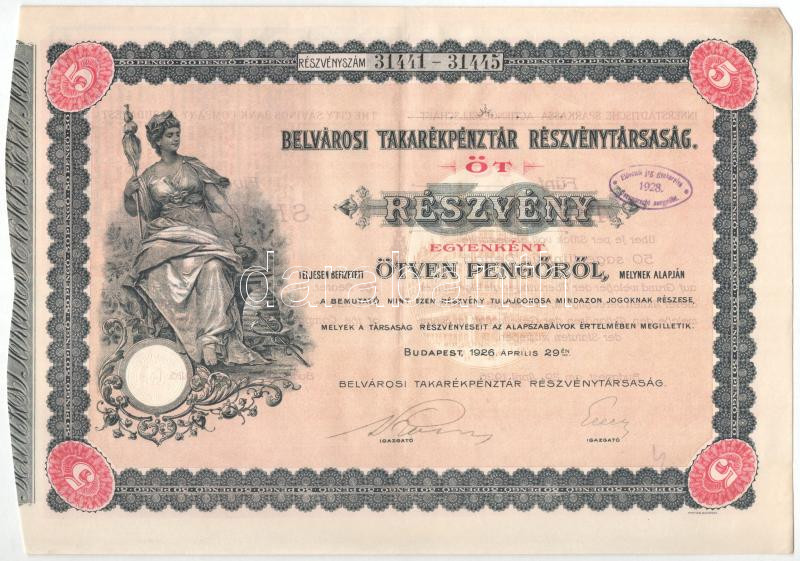 1926. Budapest "Belvárosi Takarékpénztár Részvénytársaság" ö... https://www.darabanth.com/hu/515-Filatelia-kepeslap-numizmatika-mutargy-konyv-papirregiseg-ekszer-aukcio/518.0/Numizmatika/Reszvenyek-es-sorsjegyek~663/1926-Budapest-3Cem3EBelvarosi-Takarekpenztar-Reszvenytarsasag3Cem3E-ot-reszvenye-egyben-2~II2920531