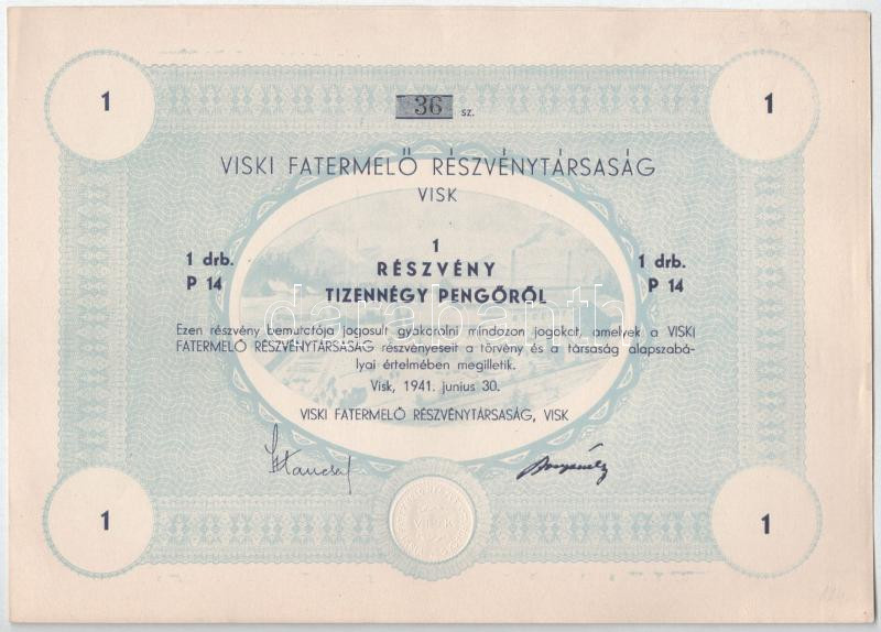 1941. Budapest "Viski Fatermelő Részvénytársaság" részvénye 14P-ről, szárazpecséttel T:AU