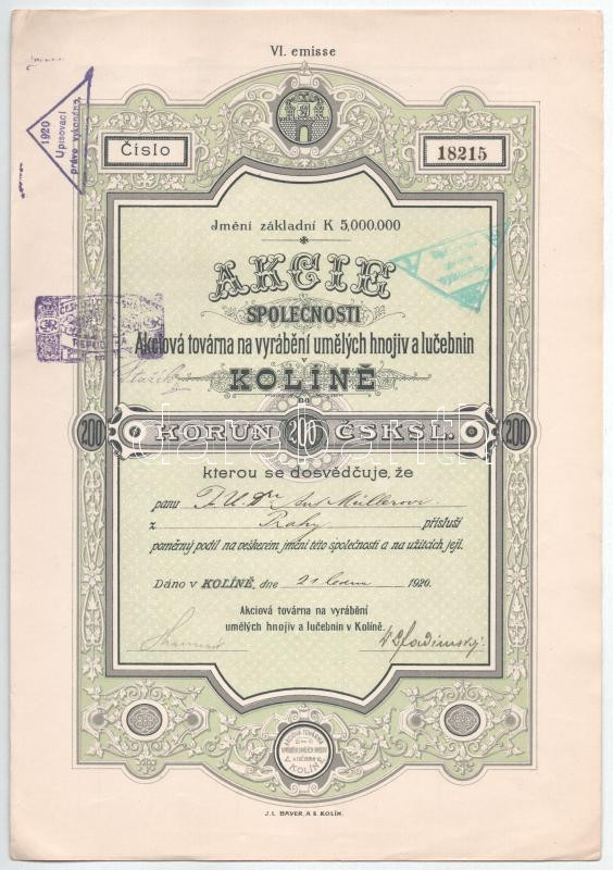 Leírás: Csehszlovákia / Kolin 1920. "Kolini Műtrágya és Növényvédőszergyártó Részvénytársaság " részvény 200K-ról, felülbélyegzésekkel T:AU