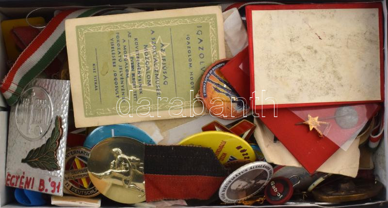 Leírás: Cipősdoboznyi vegyes tétel, főleg jelvények (magyar és külföldi), illetve sport díjérmek T:vegyes