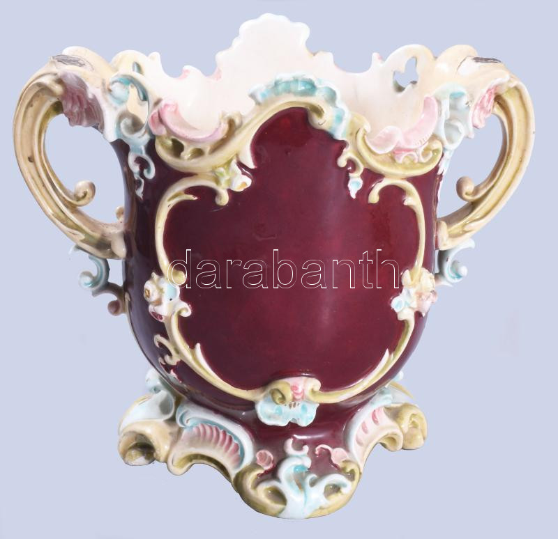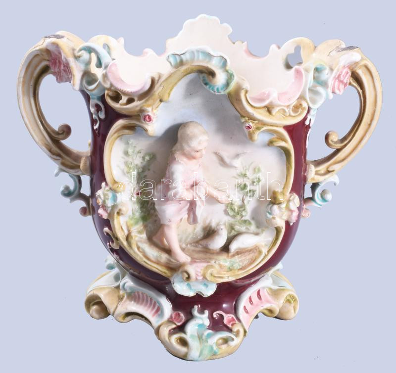 Leírás: Német fajansz, kaspó, díszváza kézzel festett, hiányos, restaurált, jelzés nélkül 18x21 cm