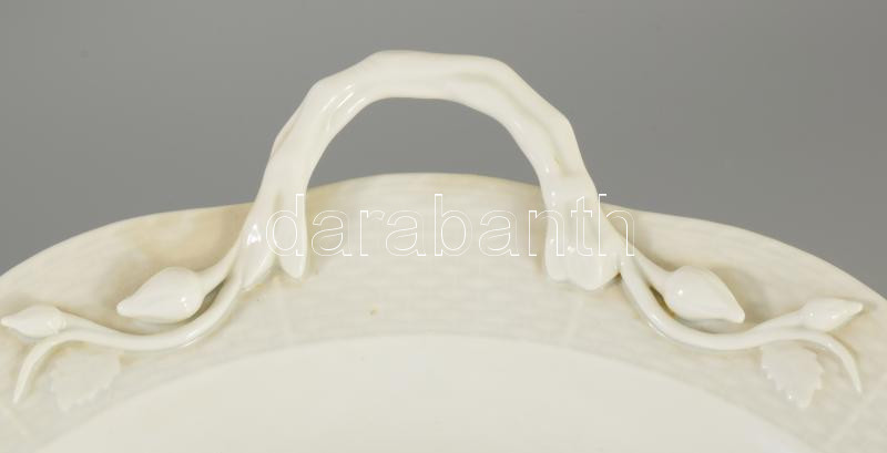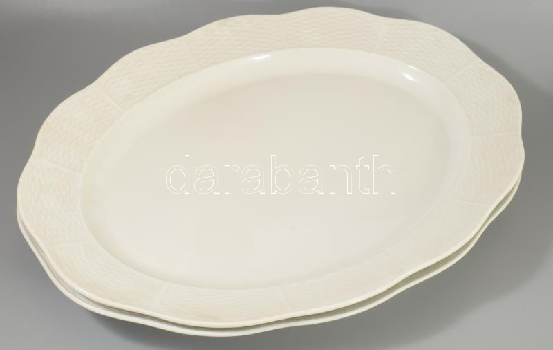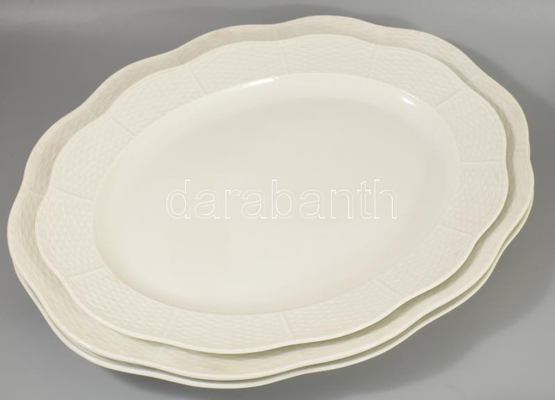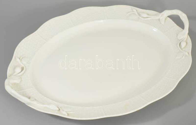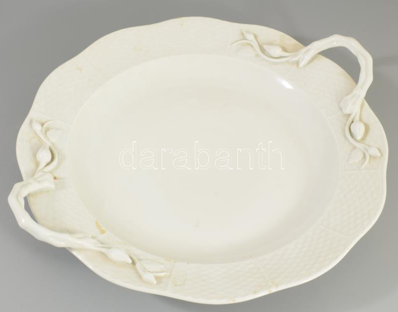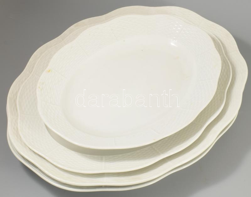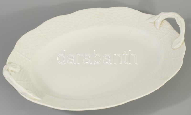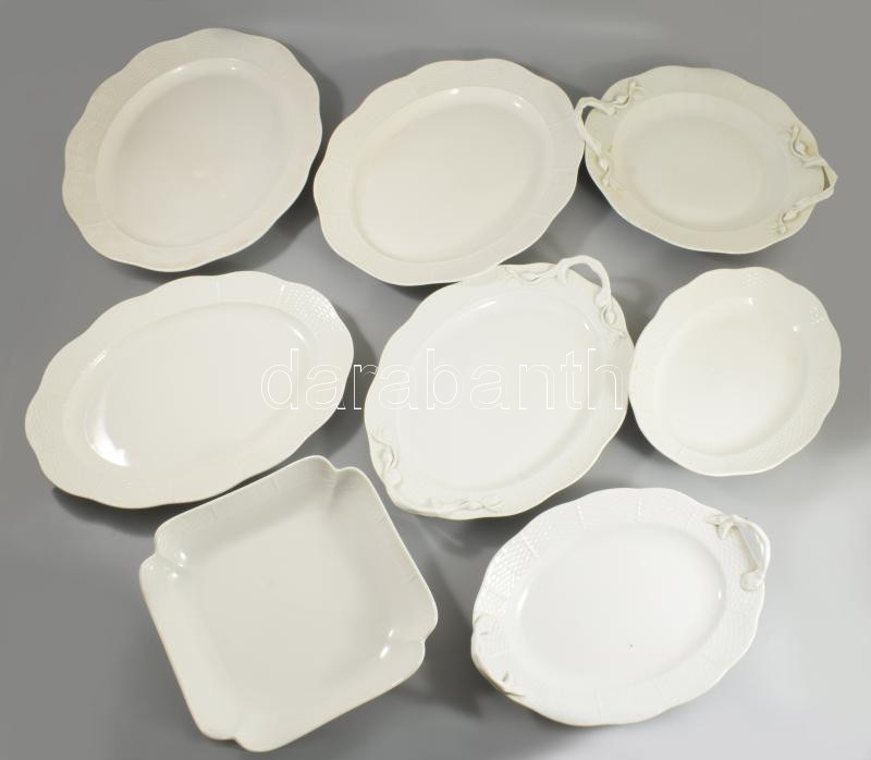 Leírás: Herendi 8 darab fehér porcelán szervírozó készlet kosárfonott peremrésszel, masszába nyomott, illetve elcsiszolt jelzésekkel, több darab plasztikus inda fogóval, kis kopottsággal, h: 42 cm alatt