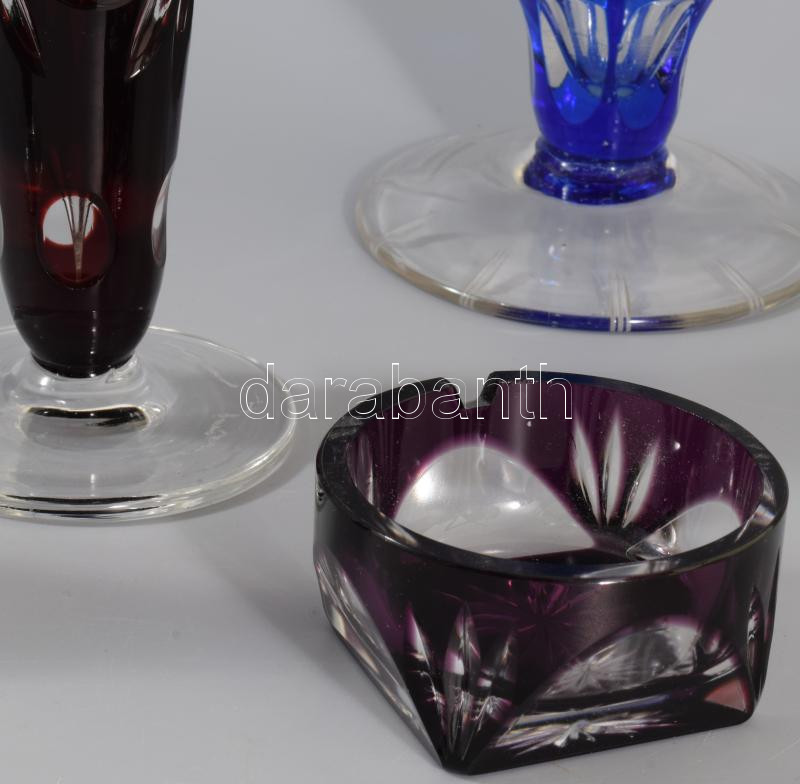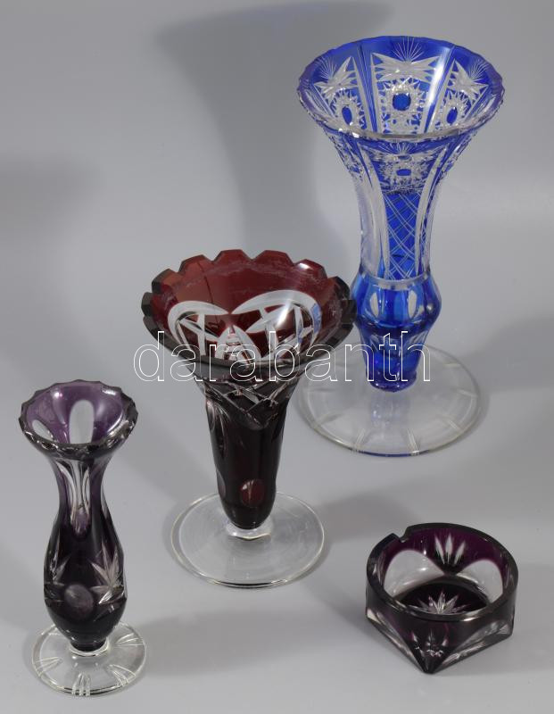 Leírás: 4 darab színesen pácolt kristály tárgy, közte lepattanással, m: 21,5 cm