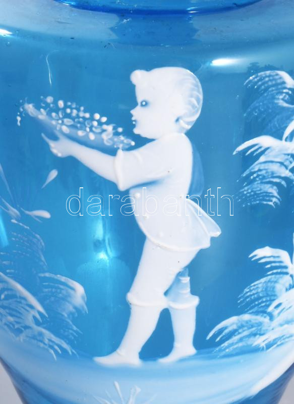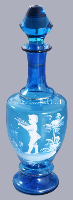 Leírás: Szecessziós zománcfestett kék italos üveg, m: 25 cm